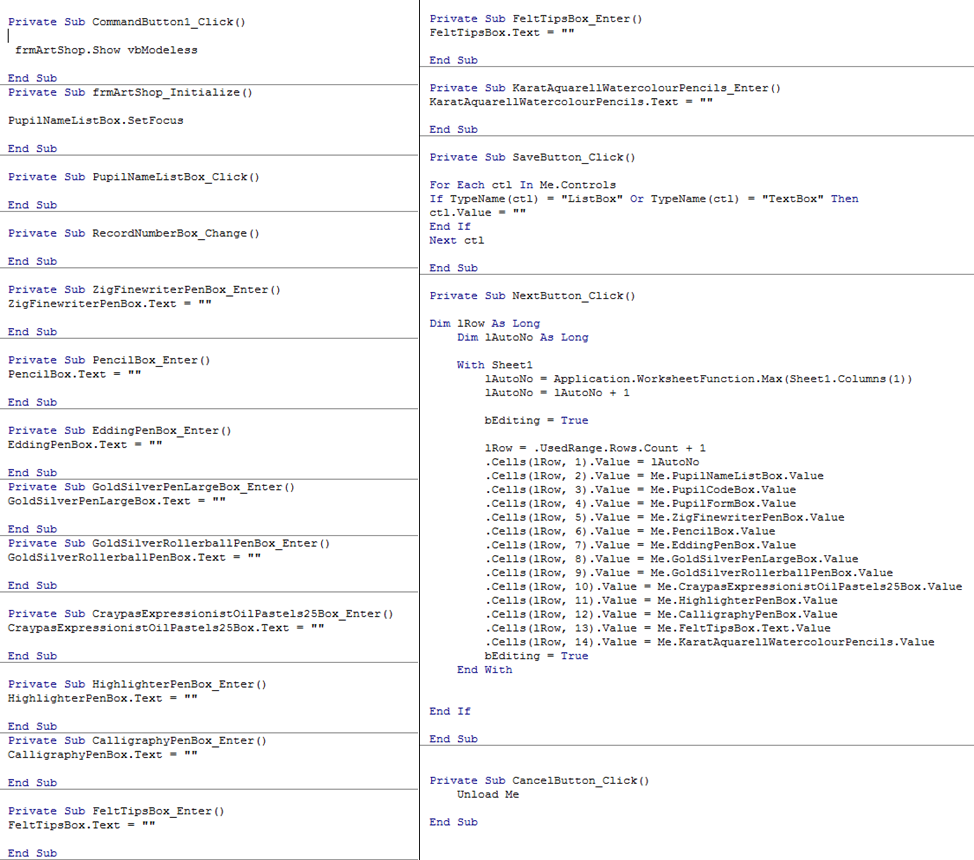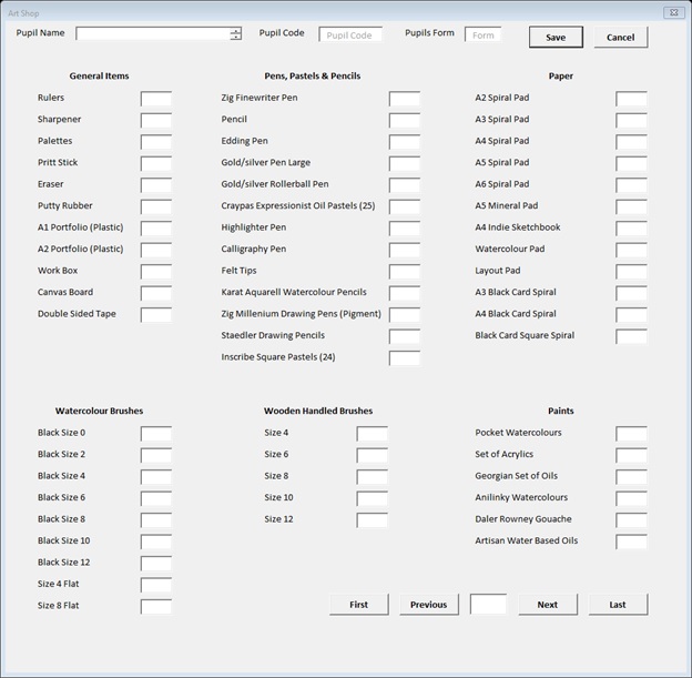 这是为学校艺术部,以便他们可以从名单中选择一个学生,并应填写学生代码和学生表格字段。然后,他们应该能够在相关字段旁边添加学生购买的任何项目的数量,然后更新Excel电子表格中的相关字段。如果该字段中有一个退出号码,则需要将其添加到该数字中。