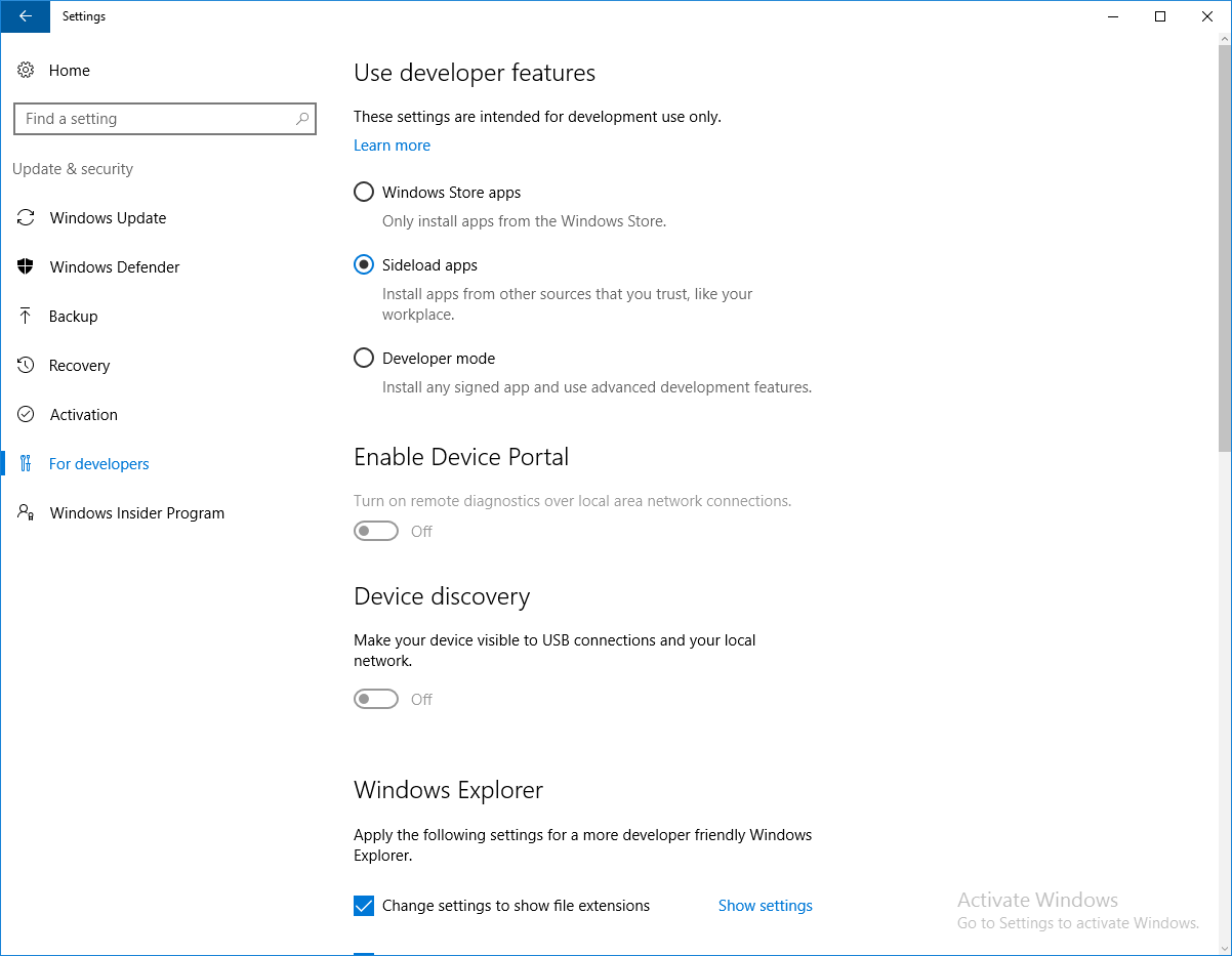 我在windows中启用了sideLoading