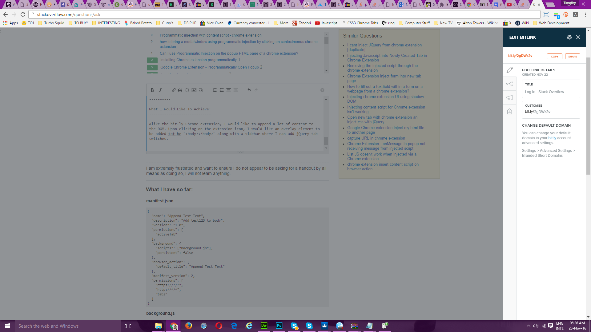 与bit.ly Chrome扩展类似,我想在DOM中添加很多内容。单击扩展图标后,我希望添加一个覆盖元素( the <body></body> )和一个侧边栏,在那里我可以添加jQuery选项卡开关。