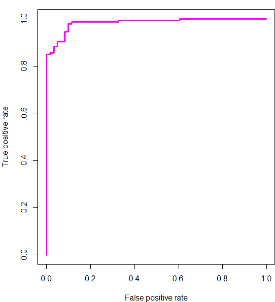 我已经绘制了ROC曲线,使用ROCR软件包,为一个2类问题。根据我的理解,曲线应该看起来像一步一步地改变图形,至少对于较小的数据集是这样。事实上,我的输入很小,但我得到的曲线基本上是直线。是因为PROC符合曲线的一条线,还是因为我错过了其他什么东西?
