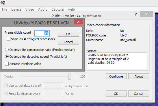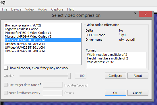 如果你捕捉屏幕,应该有UtVideo RGB选项,不知道为什么你没有它。尝试最新的安装程序http://umezawa.dyndns.info/wordpress/?p=6107