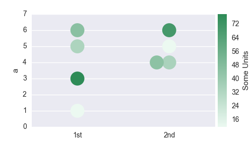 sns.swarmplot(x='Key', y = 'a', hue='c',s=20, data = df)这是我想要的方向,但是我更喜欢颜色图而不是颜色图,这样低的c值就会变成浅绿色,c值越高,绿色就越深。