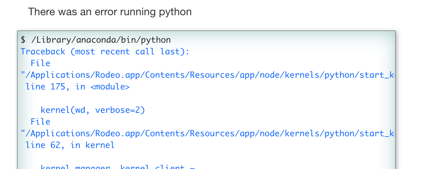 看起来您的机器上有多个anaconda,而且/Library的配置不正确,所以Rodeo正在恢复旧的。