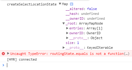 您使用的combineReducers不使用immutable。通过设置immutable,每个分支都是fromJS(blah),但不是在状态的最高级别上。使用redux-immutable代替: