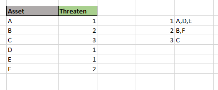 你想要做的是总结你的数据。您可以通过使用枢轴表轻松地做到这一点。只需单击“插入->数据透视表”,然后选择“资产”和“威胁”列。将这些列移动到“行标签”组中,您将有如下所示的表格(请参见所附图像)。