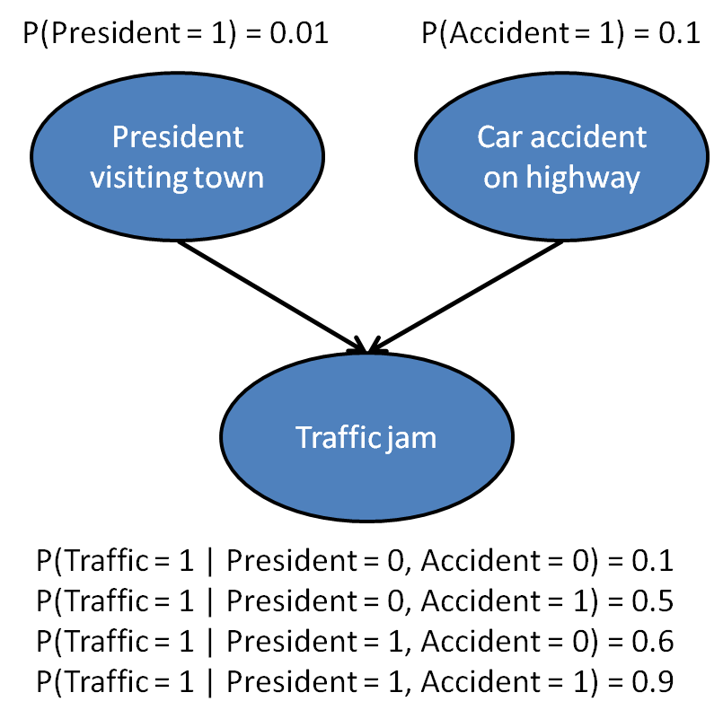 0.0504/0.1449 = 0.3478当P(Traffic = 1| President = 1, Accident = 0)和P(Traffic = 1| President = 0, Accident = 1)的概率混合时,就会产生误差。所以P(T = 1)的最终计算应该是,