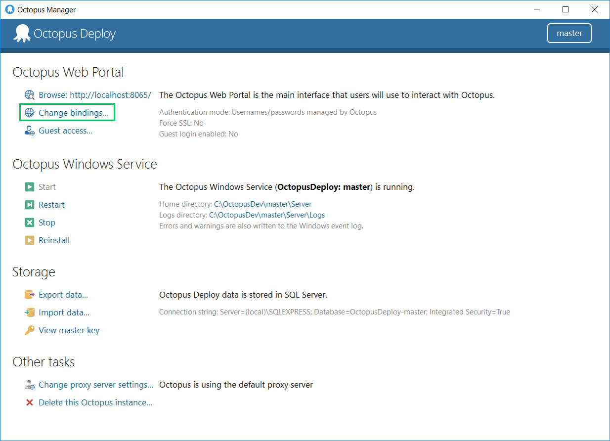 "C:\Program Files\Octopus Deploy\Octopus\Octopus.Server.exe" configure --webListenPrefixes "https://localhost/"