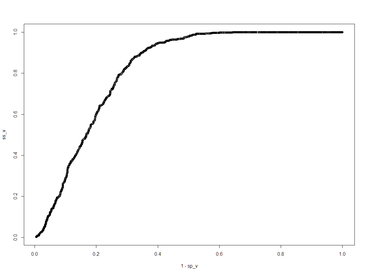 plot(1-sp_v, ss_v)大家好:我试着用不同的'cut_off‘来获得不同的'sens’(敏感)和'spci‘(spcificity)。上面代码的问题是,对于34‘削减’,我可以得到结果。但如果我把削减改为: