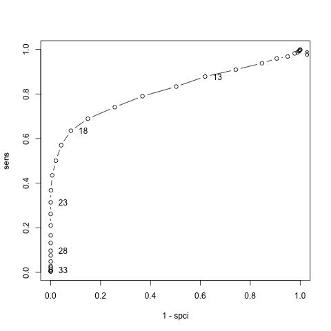 names(spci) <- paste0("sp",cuts)我不认为用每次循环迭代来处理一个新的模拟数据集的概念确实会给我留下深刻的印象,但是如果你用不同的方法来模拟某件事情的话,它可能会让我印象深刻。我也不确定您是否正确地构造了sens和spci作为敏感性和特异性,但至少现在您可以看到结果是什么样子。有几个软件包将构建ROC曲线。