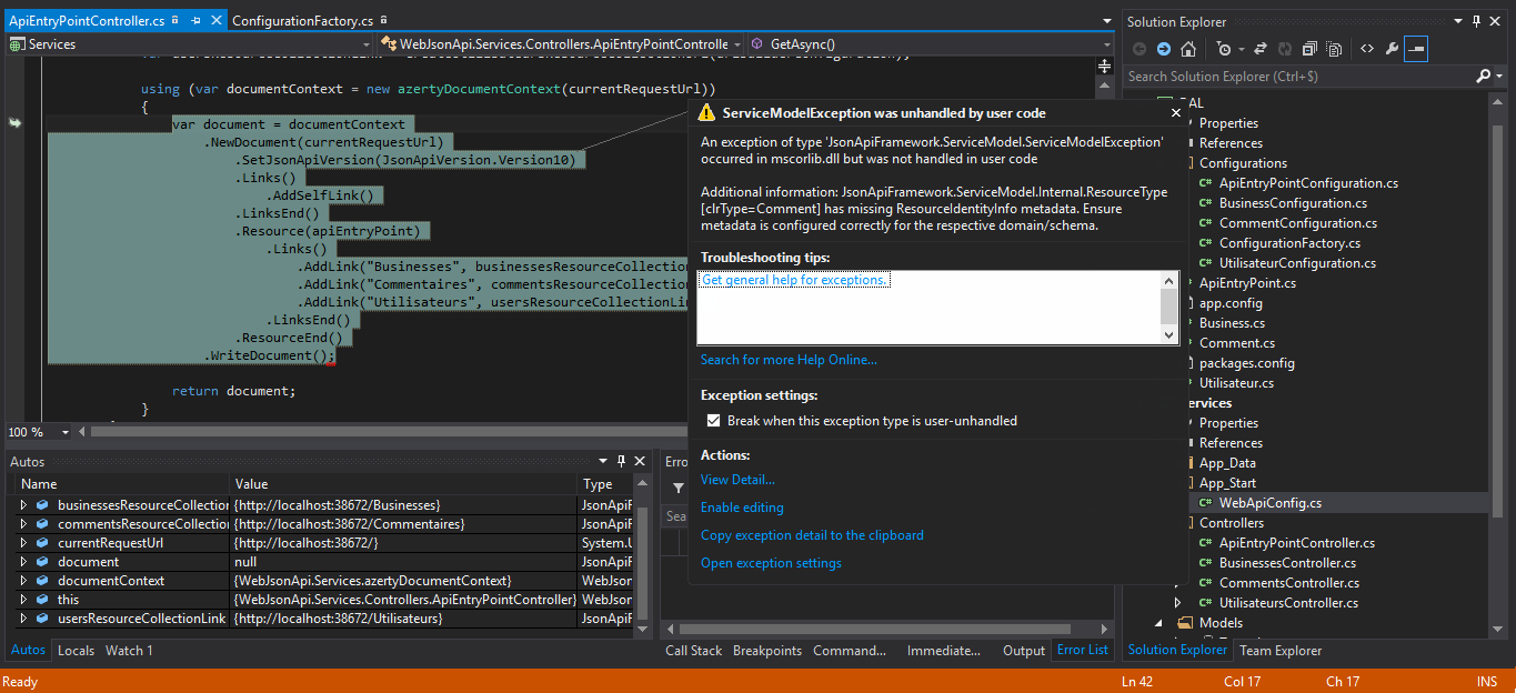 'JsonApiFramework.ServiceModel.ServiceModelException‘类型的异常发生在JsonApiFramework.Core.dll中,但未在用户代码中处理 附加信息: JsonApiFramework.ServiceModel.Internal.ResourceType clrType=Comment缺少ResourceIdentityInfo元数据。确保为相应的域/架构正确配置元数据。