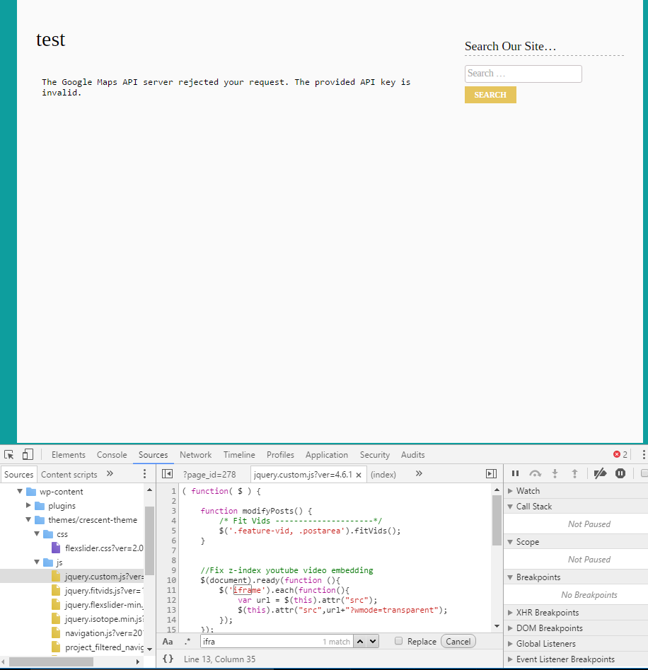在第13行,您可以看到问题的根源。这是Youtube视频的一些动作,这是开发者犯的一个严重错误。他们将?wmode=transparent添加到任何iframe的src中,包括Google地图。