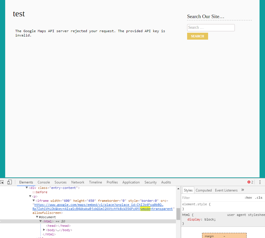 我在这个问题上已经睡了半个晚上了。我已经通过iframe将google嵌入到Wordpress站点中,并得到了一个错误: Google服务器拒绝了您的请求。提供的API密钥无效。