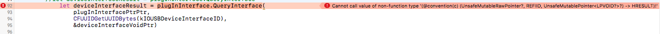 &deviceInterfaceVoidPtr)不能调用非函数类型的值“(@convention(C) (UnsafeMutableRawPointer?,REFIID,UnsafeMutablePointer?) -> HRESULT)!”