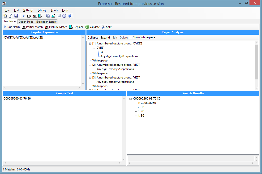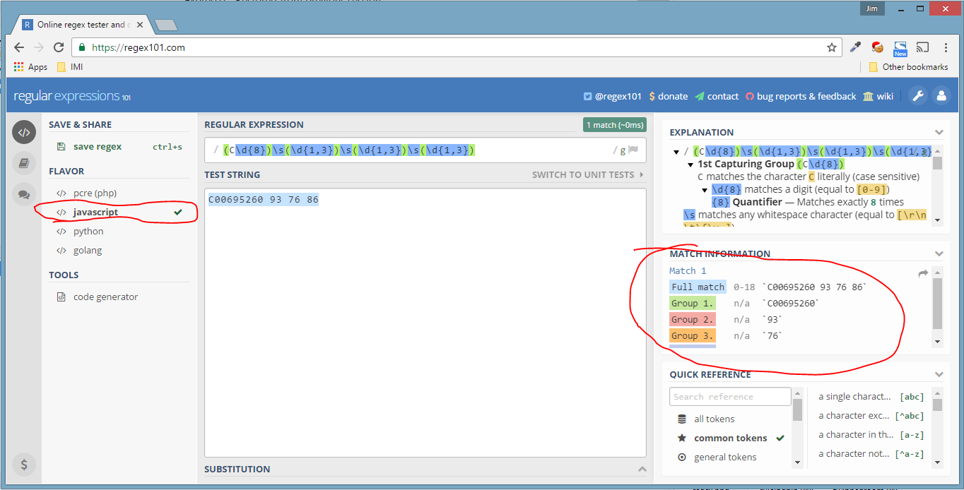 86 试图使用的regex是,/C\d{8}\s\d{2}\d?\s\d{2}\d?\s\d{2}\d?/g,它突出了我想要的崇高而不是在程序或浏览器控制台中想要的东西。它像预期的那样工作到之后,/C\d{8}\s\d{2}\d?\s/g,,但我不知道为什么。如果我做错了什么,这是我的第一篇文章。