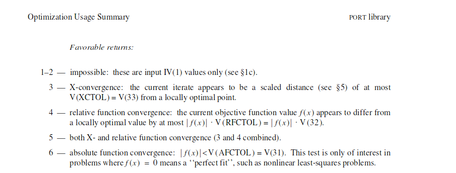 如果您使用端口算法查看nls、nlminb、optimx和其他文件的源代码,您将看到它引用了这些收敛代码的PORT文档。
