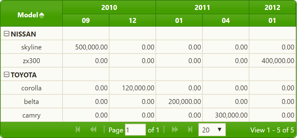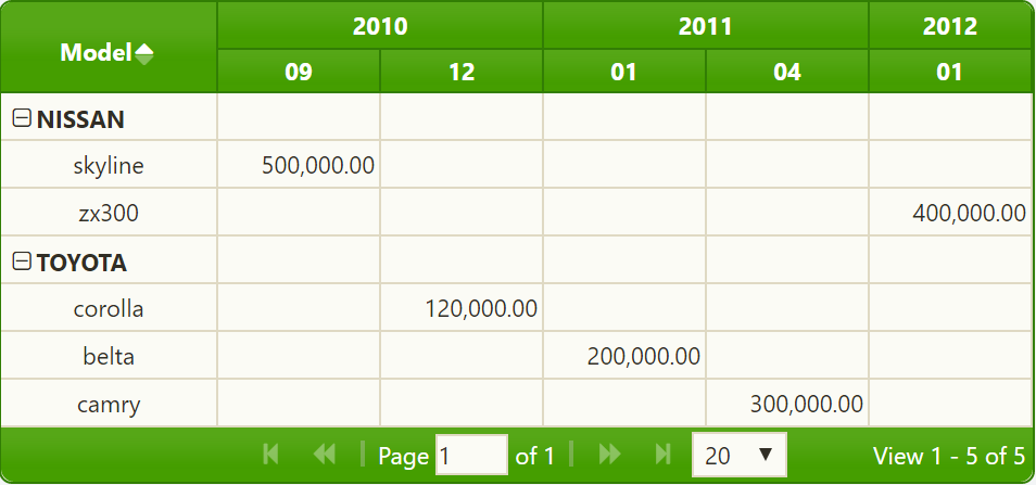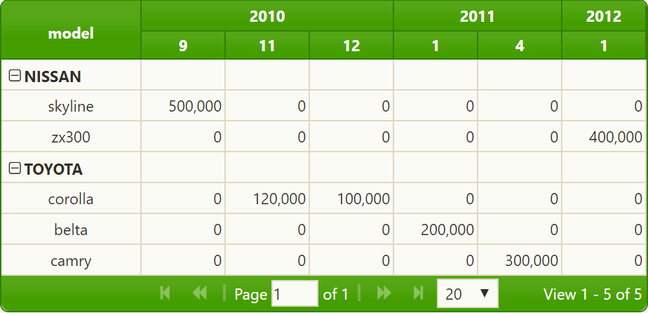现在,我必须显示jqPivot为创建jqGrid所做的工作。首先,它通过所有X和Y参数扫描所有输入数据。例如,如果您定义了以下枢轴模型