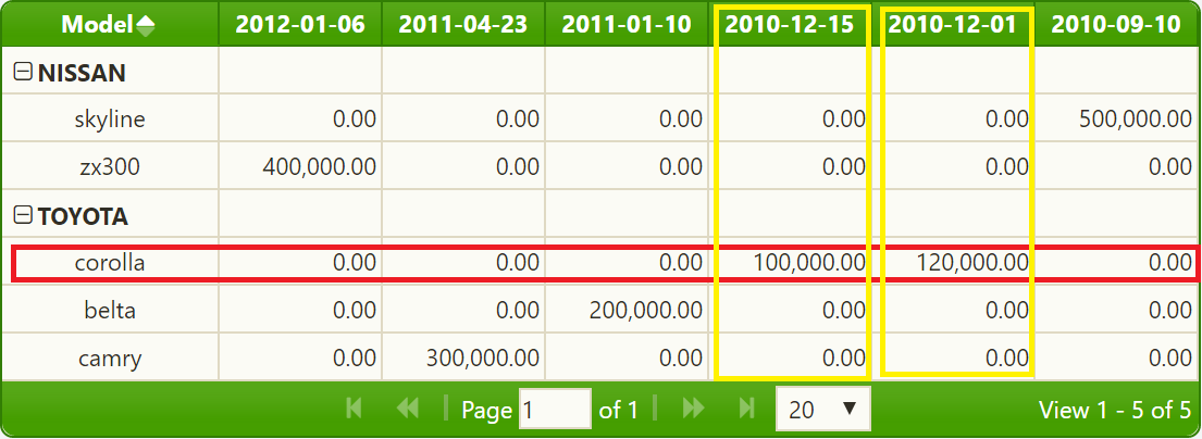 {/*x5*/ dataName: "highsalestext", hidden: true, skipGrouping: true }在jqPivot选项中,因为两个["toyota", "corolla"]源项具有不同的 fuelusagecity、fuelusagehwy和highsalestext值。salesaboveavg值是相同的,但我认为salesaboveavg的使用是相同的错误。您应该从xDimension**.** 中删除这些项