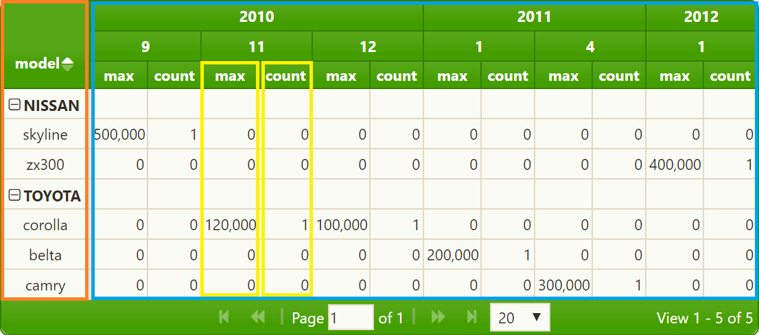 左边部分(橙色标记)表示xDimension (make和model)。它构建的主要是网格的行。右边的部分(蓝色标记)表示yDimension (输入项的year和month )。关于适当大小的信息的最低级别包含在某些输入属性上计算聚合函数(max和count)的结果(在示例中是totalnumberofsales )。