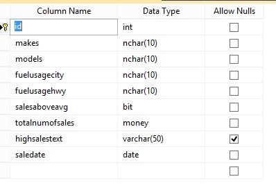 INSERT [dbo].[SalesStats] ([id], [makes], [models], [fuelusagecity], [fuelusagehwy], [salesaboveavg], [totalnumofsales], [highsalestext], [saledate]) VALUES (1, N'toyota ', N'corolla ', N'17 ', N'12 ', 0, 120000.0000, NULL, CAST(0x9A330B00 AS Date))