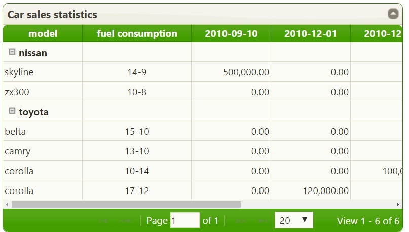var data = [{"id":1,"make":"toyota","model":"corolla","fuelusagecity":"17","fuelusagehwy":"12","salesaboveavg":false,"totalnumberofsales":120000.0000,"highsalestext":null,"salesdate":"2010-12-01"},{"id":2,"make":"toyota","model":"corolla","fuelusagecity":"10","fuelusagehwy":"14","salesaboveavg":false,"totalnumberofsales":100000.0000,"highsalestext":"HIGH","salesdate":"2010-12-15"},{"id":3,"make":"toyota","model":"belta","fuelusagecity":"15","fuelusagehwy":"10","salesaboveavg":true,"totalnumberofsales":200000.0000,"highsalestext":null,"salesdate":"2011-01-10"},{"id":4,"make":"toyota","model":"camry","fuelusagecity":"13","fuelusagehwy":"10","salesaboveavg":false,"totalnumberofsales":300000.0000,"highsalestext":"HIGH","salesdate":"2011-04-23"},{"id":5,"make":"nissan","model":"skyline","fuelusagecity":"14","fuelusagehwy":"9","salesaboveavg":true,"totalnumberofsales":500000.0000,"highsalestext":"HIGH","salesdate":"2010-09-10"},{"id":6,"make":"nissan","model":"zx300","fuelusagecity":"10","fuelusagehwy":"8","salesaboveavg":false,"totalnumberofsales":400000.0000,"highsalestext":null,"salesdate":"2012-01-06"}];