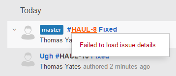 我已经正确配置了UpSource和YouTrack,两者都可以相互获取信息。但我经历了一些很奇怪的事情。我将提交提交到主分支,UpSource正确地显示了信息,但是我链接到了YouTrack问题中的一个问题,当我悬停在这个问题上时,信息无法显示,我也不知道原因。