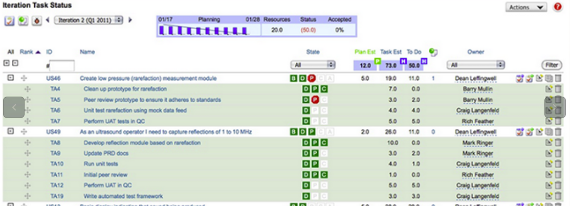 在这张图片上,我们可以看到用户故事点,任务时间和每个任务和故事的状态。当每个任务被移动到完成状态时,整个用户故事被标记为已完成。