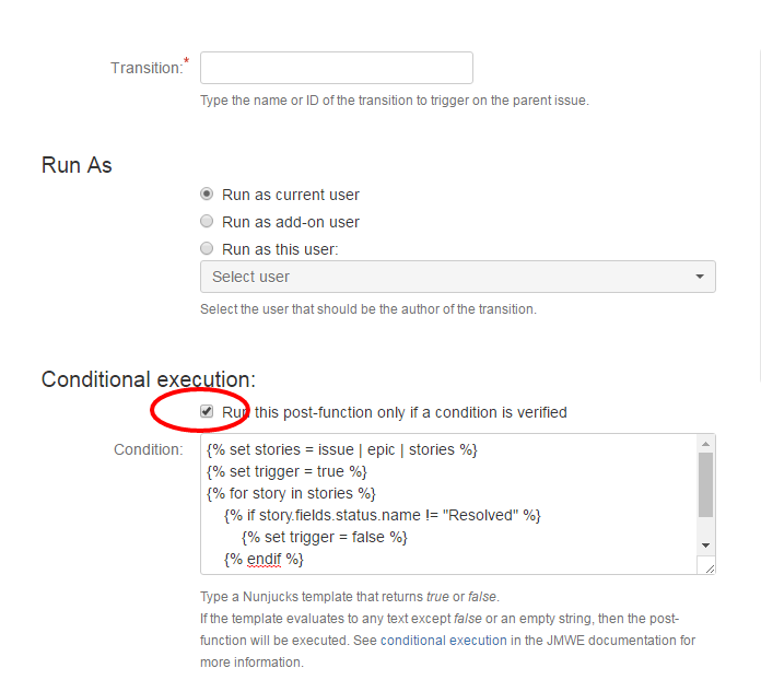Conditional Execution并键入以下条件:{% set stories = issue | epic | stories %} {% set trigger = true %} {% for story in stories %} {% if story.fields.status.name != "Resolved" %} {% set trigger = false %} {% endif %} {% endfor %} {{ trigger }}