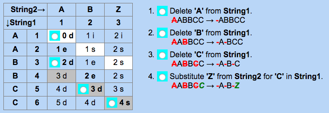 似乎你可以用DL计算产生的矩阵做些什么。本站产生上面的输出。下面的文本说,您应该从矩阵的右下角走,遵循每个单元格中的每个最低成本操作(跟随粗体单元格):