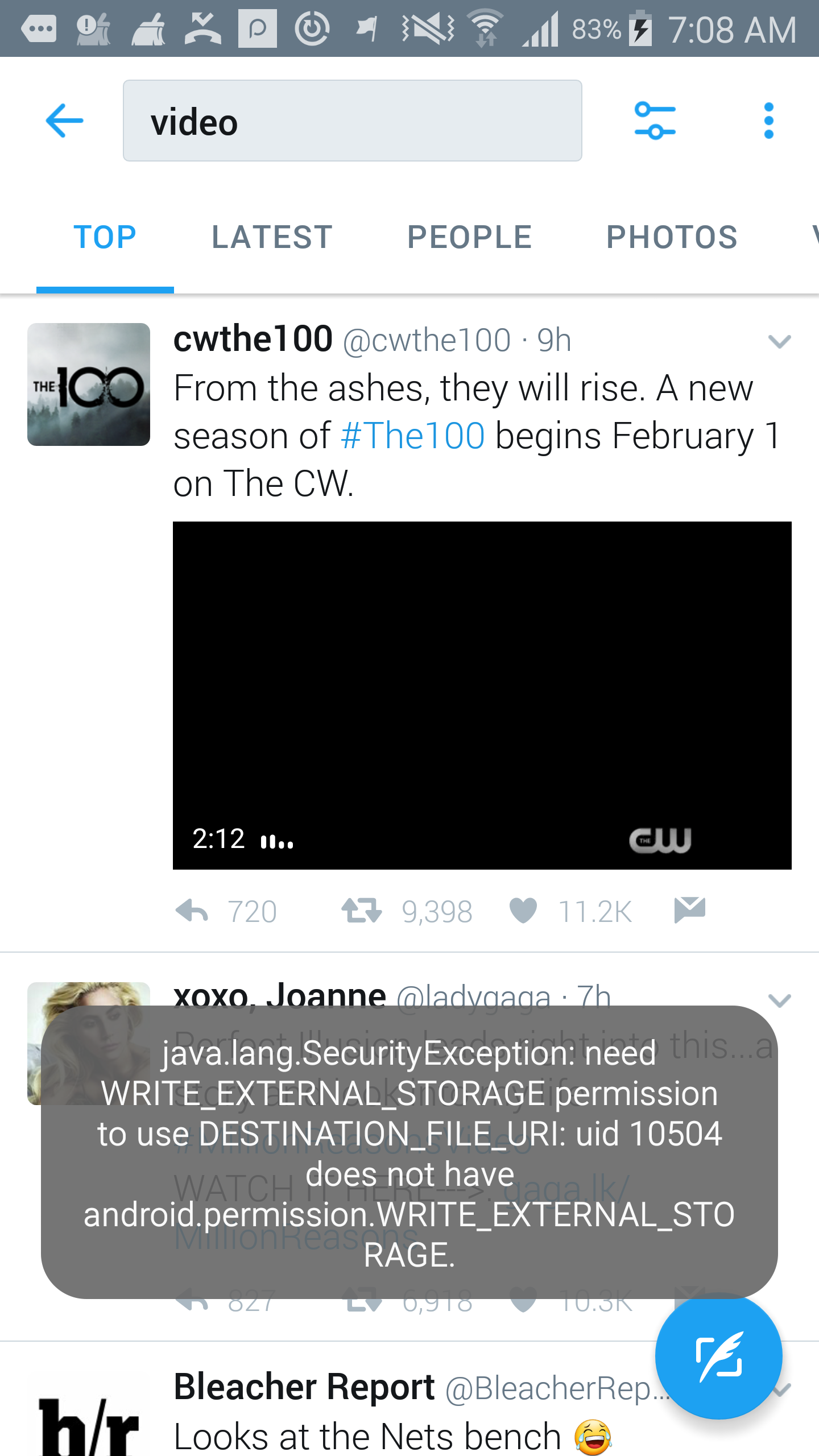 java.lang.SecurityExeption:需要WRITE_EXTERNAL_STORAGE许可才能使用DESTINATION_FILE_URI: uid 10504没有android.permission.WITE_EXTERNAL_STORAGE
