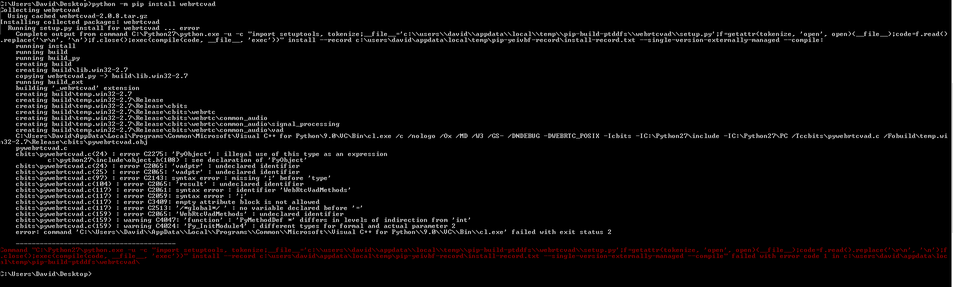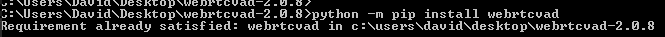 经过一些研究之后,我尝试通过pip安装webRTC VAD模块。在我提取的文件夹中执行此操作时,我会得到以下内容: