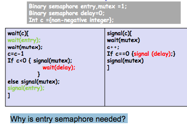因此,我很难理解为什么我们需要输入信号量,我可以看到它是如何正确地工作,没有它。多个进程如何进入关键部分?在第一个进程进入后,它会等待(互斥),这意味着没有其他人能够进入,而且还有其他进程等待信号(互斥)。