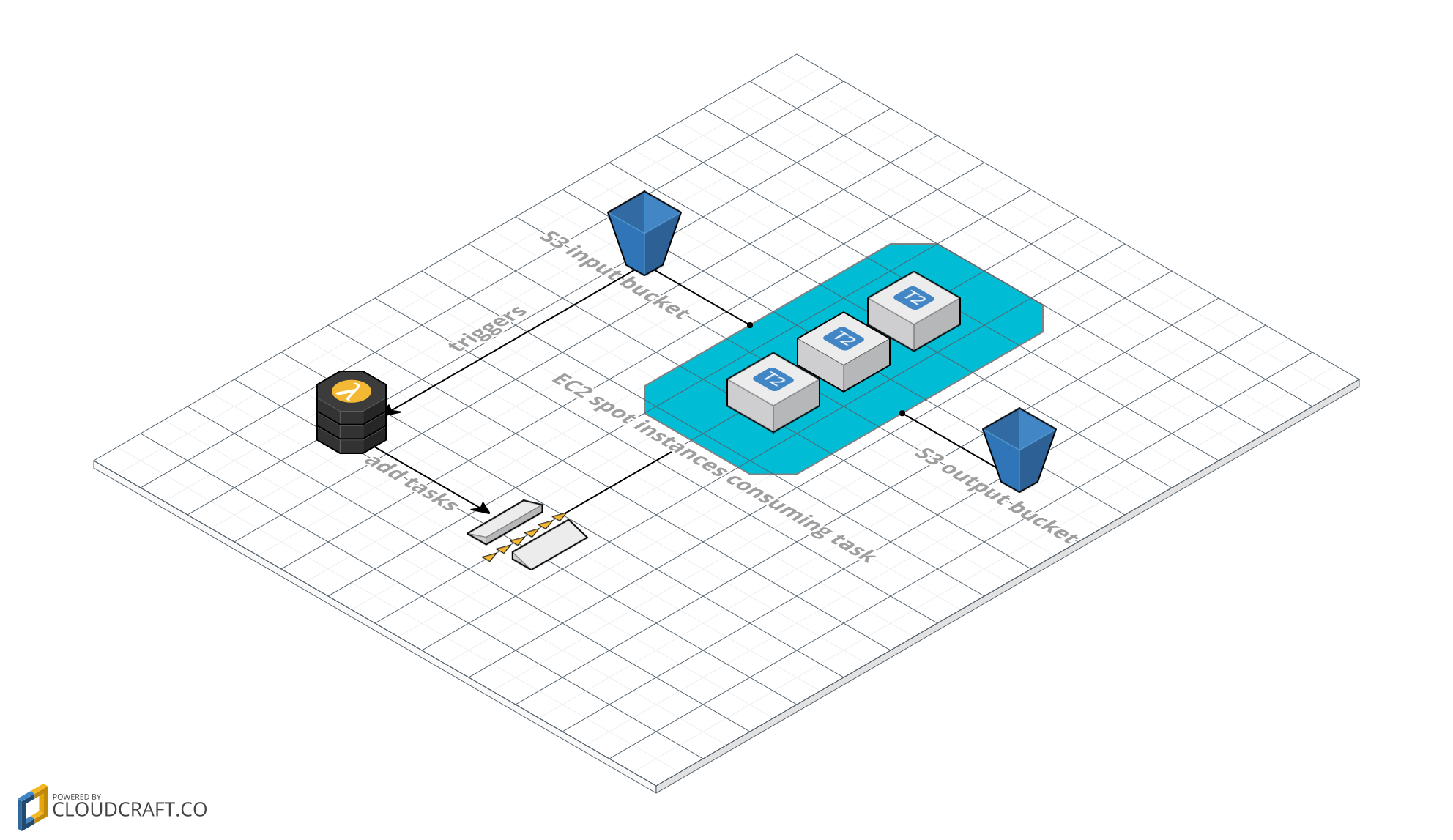 S3输入buquet (PNG图像压缩)->触发器lambda函数->放置SQS消息/任务->由EC2 spot意图消耗。