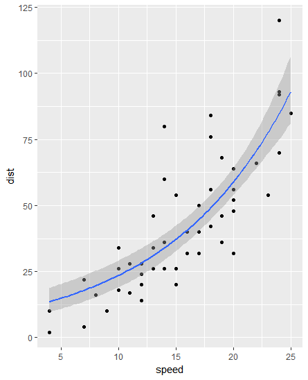 myplot + geom_line(aes(x=speed, y=exp(predict(lm(log(dist)~speed)))))发布于 2016-12-16 18:33:14