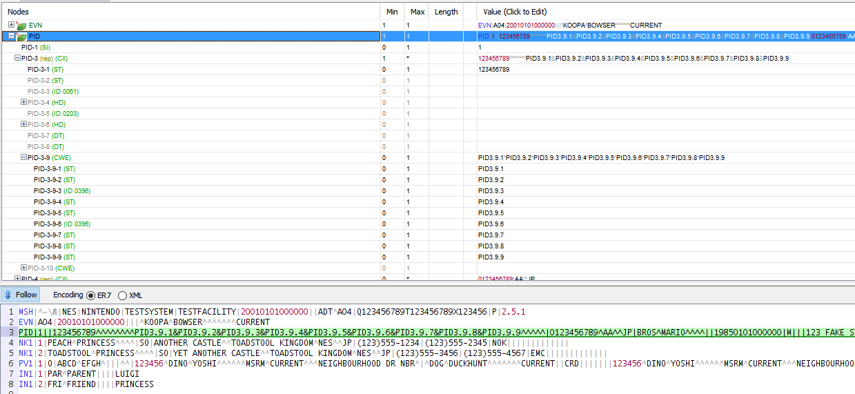 PID|1||123456789^^^^^^^^PID3.9.1&PID3.9.2&PID3.9.3&PID3.9.4&PID3.9.5&PID3.9.6&PID3.9.7&PID3.9.8&PID3.9.9^^^^^|0123456789^AA^^JP|BROS^MARIO^^^^||19850101000000|M|||123 FAKE STREET^MARIO \T\ LUIGI BROS PLACE^TOADSTOOL KINGDOM^NES^A1B2C3^JP^HOME^^1234|1234|(555)555-0123^HOME^JP:1234567|||S|MSH|12345678|||||||0|||||N