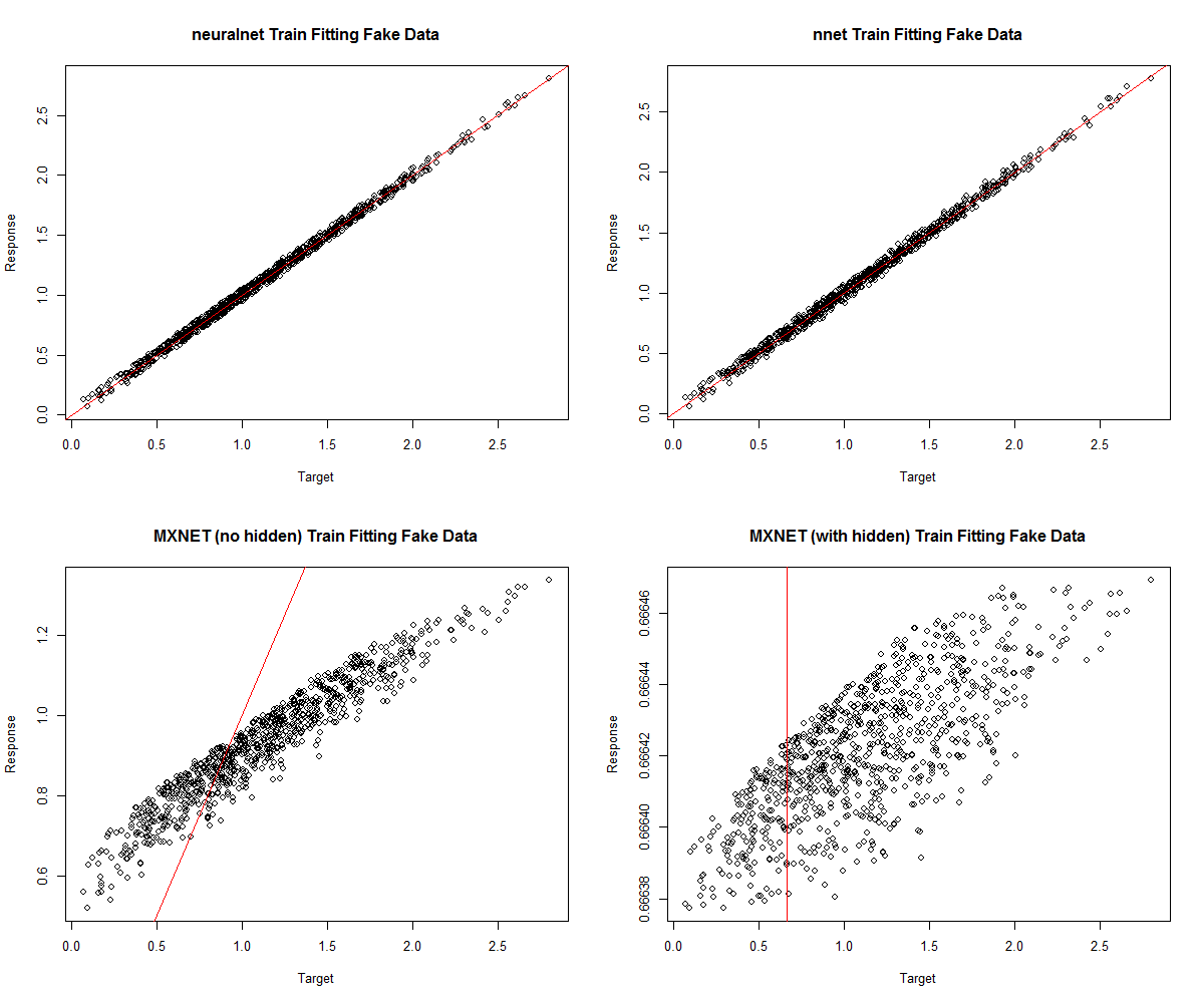 main="MXNET (with hidden) Train Fitting Fake Data", xlab="Target",