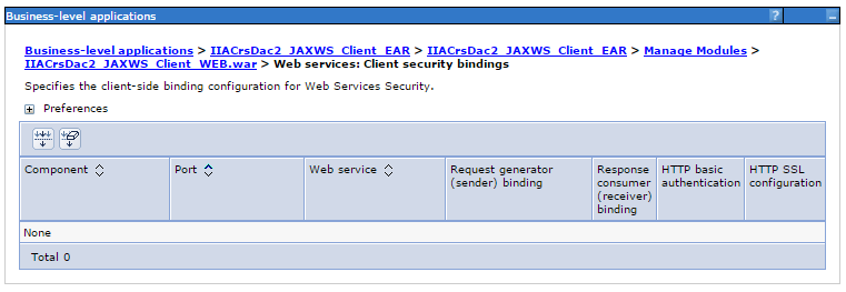 我们假设必须以某种方式在应用程序>应用程序类型> WebSphere企业应用程序> application_name >管理模块> module_name服务:客户端安全性绑定中创建"Web服务客户端安全性绑定“,但该列表是空的:
