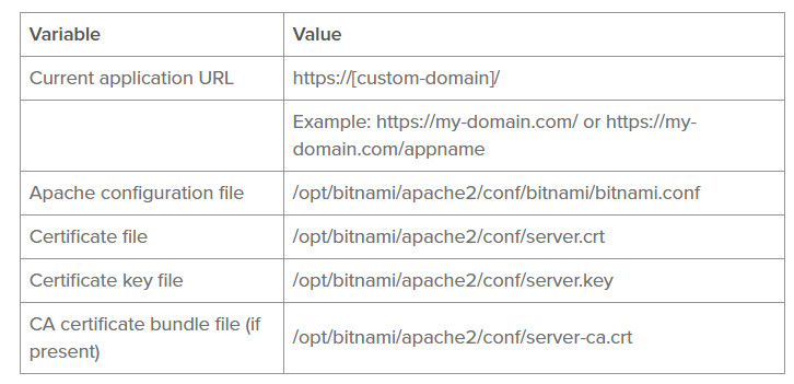 Bitnami映像附带了已经预先配置的SSL支持和一个虚拟证书。虽然这个虚拟证书可以用于测试和开发目的,但您通常希望使用有效的SSL证书用于生产。您可以自己生成(在这里解释),也可以从商业证书颁发机构购买。