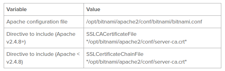 如果您的证书颁发机构还向您提供了PEM编码的证书颁发机构(CA)包,则必须将其复制到上一个表中的正确位置。然后,修改Apache文件,使其包括SSLCertificateKeyFile指令下面的一行。根据场景和Apache版本选择正确的指令: