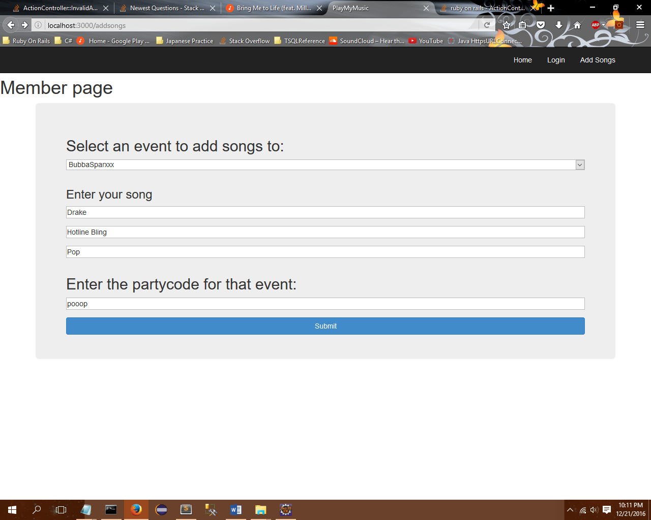 我有一个程序,允许用户为某一事件输入他们的歌曲。您必须输入该事件的partycode才能提交。下面是它的截图: