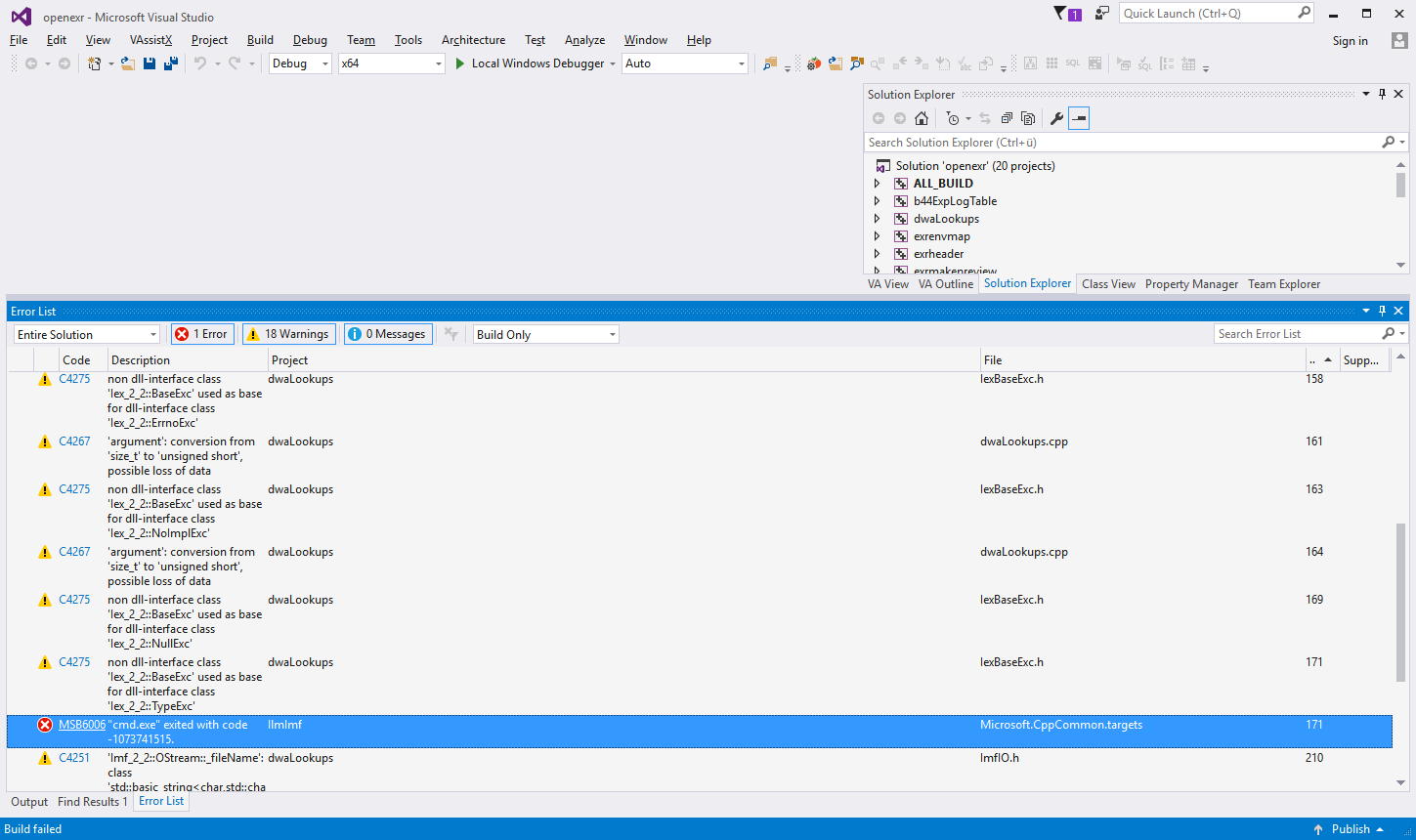..\openexr我正在打开openexr.sln,而不是试图构建IlmInf。有一个错误:代码-1073741515退出"cmd.exe“