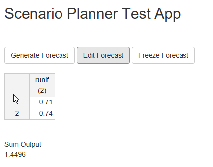 我想让我的rhandsontable只在单击动作按钮“冻结预测”时阅读,并在单击“编辑预测”时激活该表。它应该显示在单击“生成预测”按钮上的求和输出。