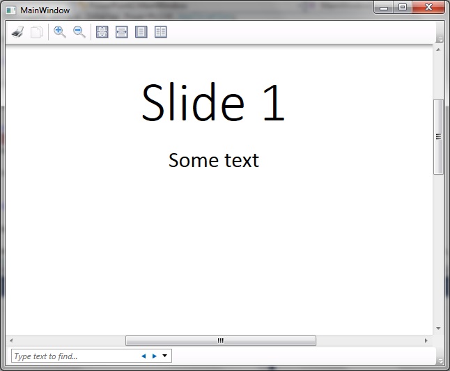 我的问题是,如何进一步修改我的代码,以便将PowerPoint不仅显示为所显示的一系列可滚动幻灯片,而且还显示为实际幻灯片?我想做进一步的更新,使用户能够导航到下面的幻灯片上的每一个鼠标点击-像一个‘适当的’演示文稿。我的问题是,我不熟悉XpsDocument Apis的用法--我不知道是用这些来实现我想要的,还是在表示变量的设置属性中转换成Xps格式。