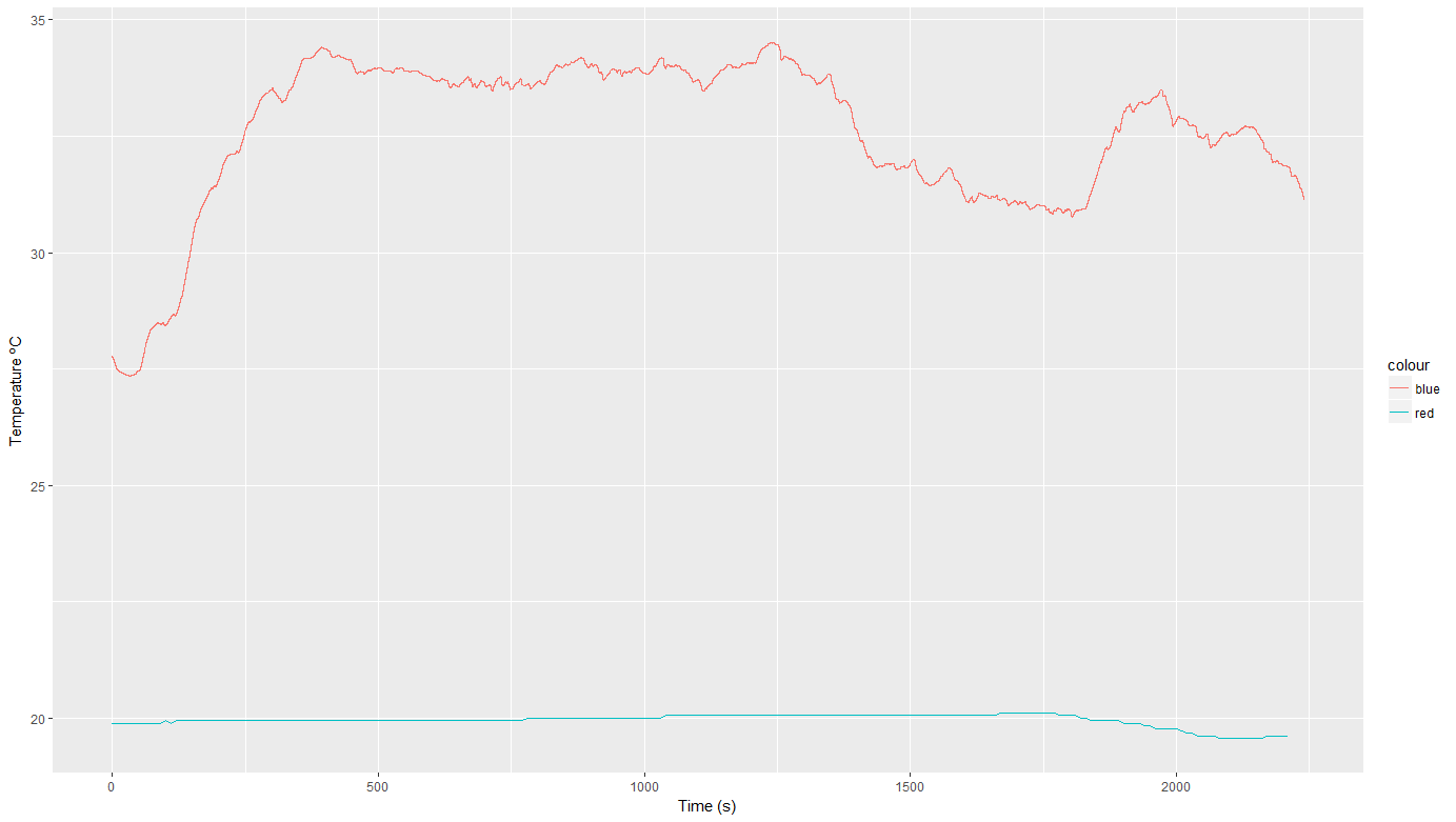 geom_line(data = P1IAQ, aes(x = Time, y = Temp, color = "red")) +