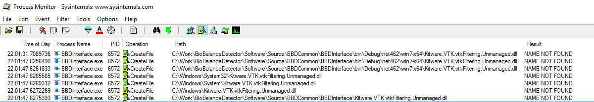 所以,首先,我想知道我的进程到底在哪里寻找缺少的DLL。我使用了Sysinternals套房和它的过程监视器。