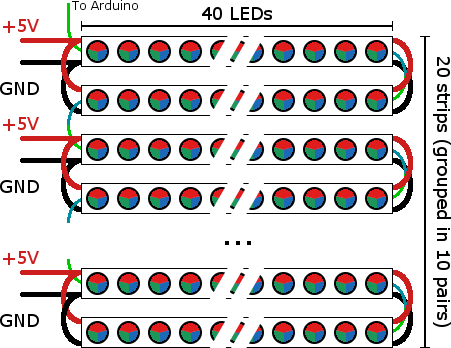 这就是说,40x20 leds是800个leds,这意味着40A (加上arduino)。这个电流真的很大,需要适当的思考如何把它送到leds上。