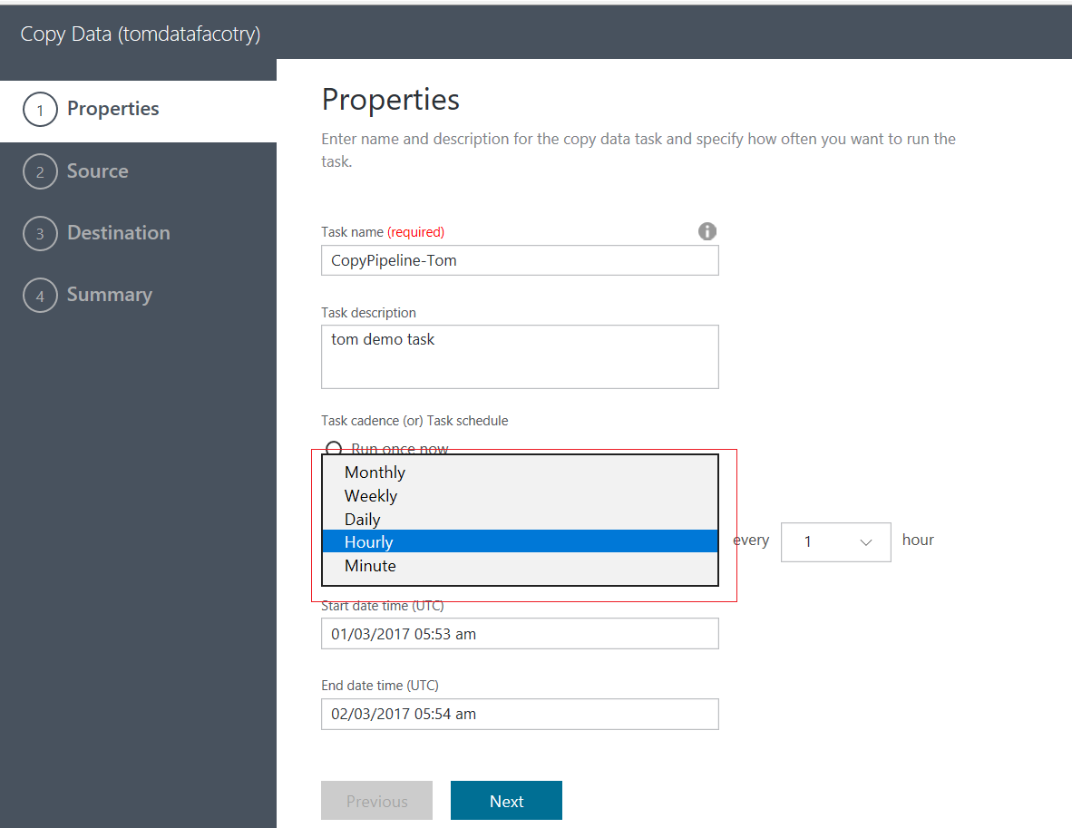 3.单击“复制数据”(预览)设置属性,可以将循环模式设置为分钟、小时、每日…。如我们所愿
