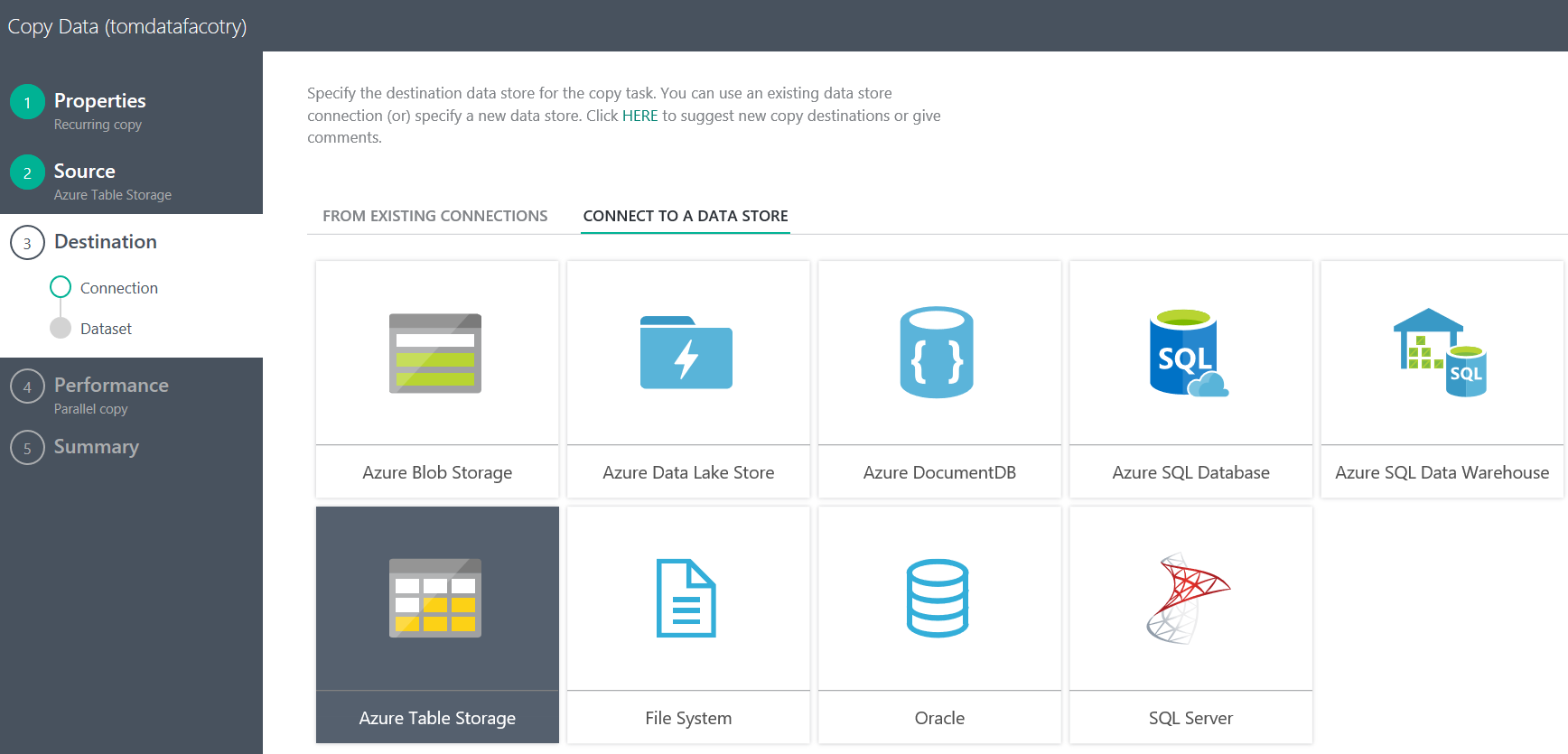 4.选择我们喜欢的源数据存储,在演示中我选择了azure表。