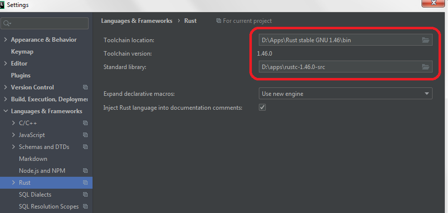 (用CLion 2020.2.1测试,锈蚀-1.46.0-x8664-pc-windows-gnu.msi,rustc-1.46.0-src.tar.gz。离线Rust安装程序和来自那里的源代码存档:https://forge.rust-lang.org/infra/other-installation-methods.html )