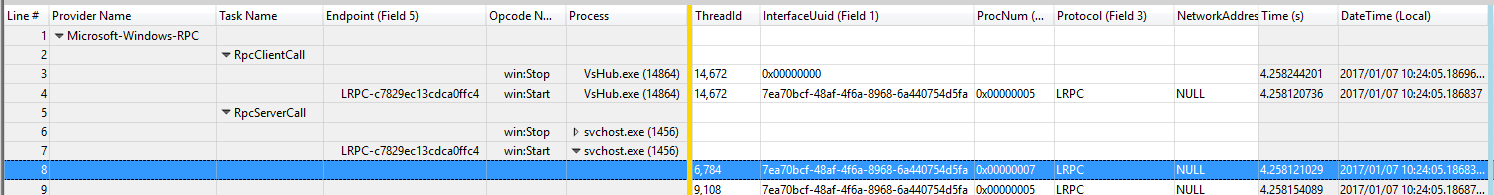 我记录了一个在Windows上执行本地RPC调用的应用程序的跟踪。我在启用Microsoft-Windows-RPC提供程序时使用了xperf。打开跟踪之后,我意识到关联客户机和服务器调用并不那么简单。用一个例子来解释这个问题就更容易了。