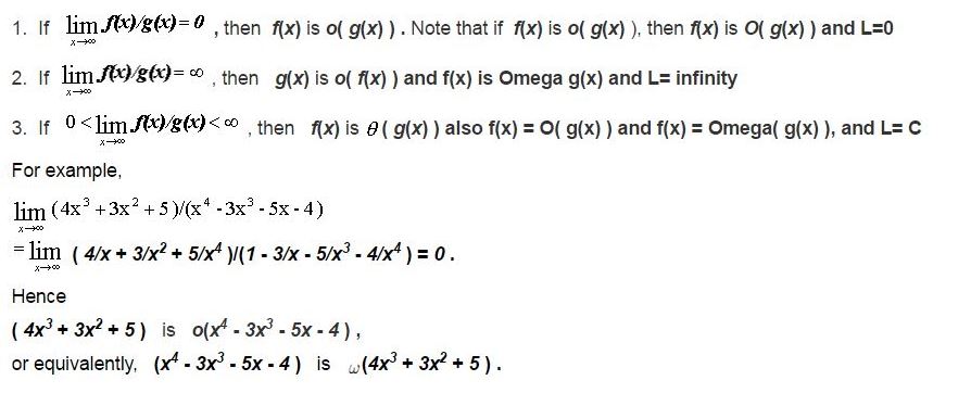 此外,对这些规则是否有任何正式的证明?我已经为其中的几个(大-O,小θ,小-欧米加)写了证明。但我和其他人有麻烦--也就是此刻,大欧米茄。我使用极限比率,然后用形式极限的定义来转换,然后应用渐近符号的定义。